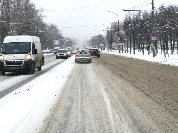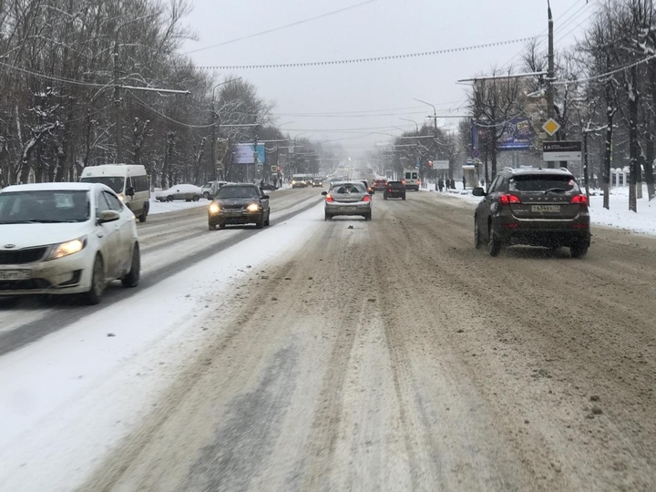При настоящей интенсивности снегопад покрывает ровным слоем снега и второстепенные улицы, и центральный тульский проспект Ленина.