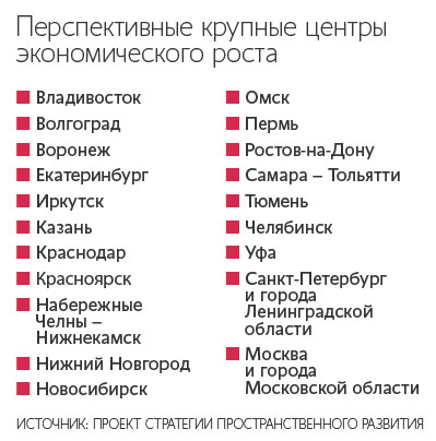 Стратегия, с помощью которой власти рассчитывают координировать федеральную и региональную экономическую политику, разделяет территории на разные типы: крупные города и городские агломерации, малые и средние города, сельские поселения, агропромышленные и минерально-сырьевые центры. 20 из них получили статус крупнейших городских агломераций (их вклад в совокупный ВВП превышает 1%) – например, Красноярск, Краснодар, Москва, города Московской области. Еще 21 крупная агломерация обеспечит от 0,2 до 1% роста экономики (Норильск, Тамбов, Сочи и др.), а 31 город и муниципальное образование – менее 0,2% (Нальчик, Абакан, Курск и др.).