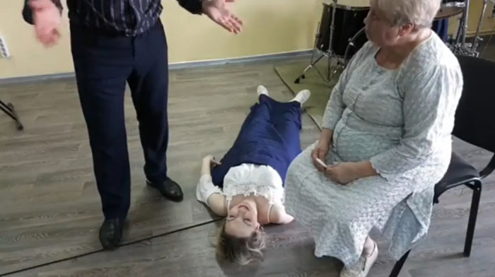 На другом ролике сам Комаров что-то монотонно говорит блондинке, затем подходит его ассистент, готовый поймать девушку в случае, если она упадет. Комаров «изгонял» из нее «демонов», совершал пассы руками, будто бьет по лбу ладонью. В результате ему удалось повалить с ног даму. Пока она билась в конвульсиях на полу, к ней подвели пожилую женщину, которая села рядом на стул, и начала над ней петь какие-то песни про радость.