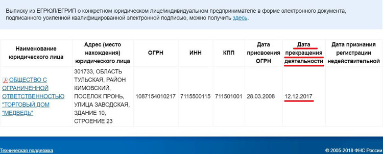На самом деле ТД «Медведь» окончательно обанкрочен, никто его не реанимировал, что подтверждается информацией с официального сайта ФНС: