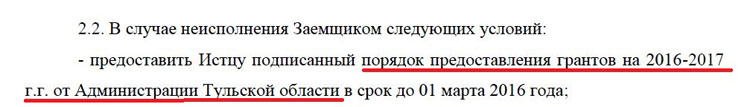 Поэтому руководству Тульского отделения Сбербанка пообещали, что ТД «Медведь» опять получит гранты из областного бюджета. А даже взяли на себя обязательство предоставить Сбербанку подписанный порядок предоставления грантов на 2016-2017 гг.: