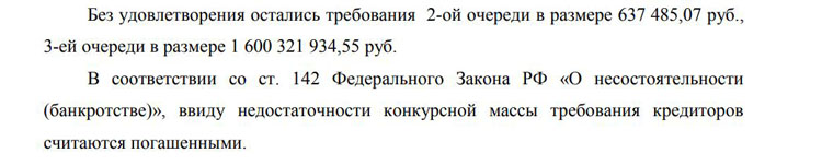 Незалоговые требования кредиторов третьей очереди реестра были погашены менее чем на 3%, следовательно, «зареестровые» требования остались совершенно неудовлетворенными. В итоге, около 700 млн рублей налоговой задолженности «Медведя» уже никогда не попадут в бюджет (подробнее здесь).
