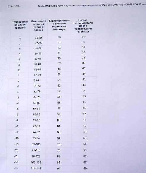 График подачи тепла для Москвичей естественно правильный, там людей грамотных и инициативных много, сразу поставят на место, а в Туле и области теплоноситель подают ниже нижнего предела, и если возникает жалоба, то пока соберут комиссию естественно с участием представителя котельной то в этот день топят как положено и составляют Акт о нормальном отоплении. Действительно пользуясь такой уловкой теплоснабжающие компании обнаглели и начинают топить ниже нижнего предела, жулики грамотные и бессовестные, дать им по рукам надо, но в администрациях работают не квалифицированные специалисты и в этом вопросе не смыслят. Все это можно было бы понять если бы они за эту экономию проводили кап. Ремонт теплотрассы и котельных в летний период.