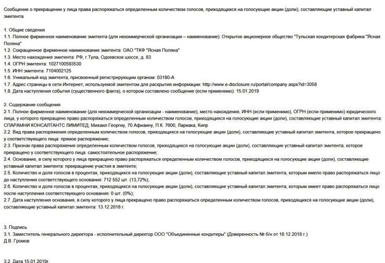 Кипрская компания Sparamni Consultants Limited вышла из состава акционеров тульской кондитерской фабрики «Ясная Поляна».