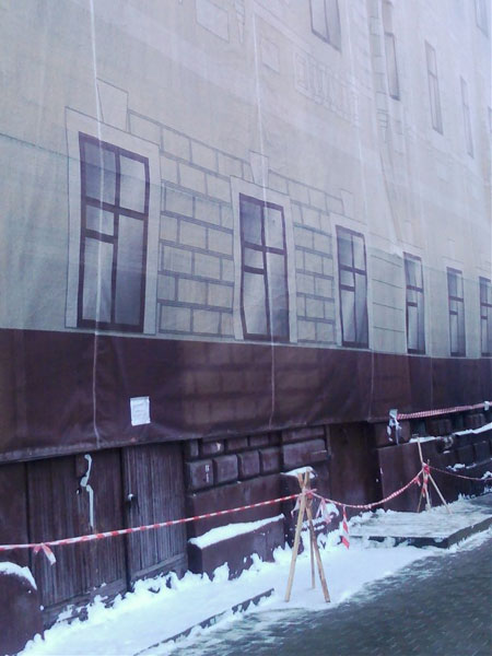 Но, после пожара, здание стоит без крыши и разрушается. И да, оно тоже завёрнуто в грязную и рваную тряпку!!!