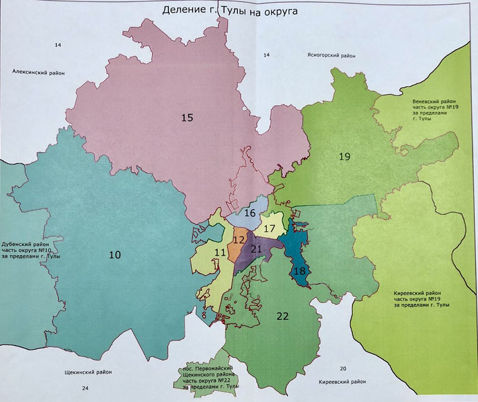 «Если говорить о Туле, — пояснил председатель Избирательной комиссии Тульской области Павел Веселов, — Советский район стал одним избирательным округом, Заречье делится на две части: 16-ый округ – это чистое Заречье, другая часть Заречья и бывшая территория Ленинского района, входящая в городской округ Тула, составили еще один округ. В Пролетарском районе 17-ый и 18-ый округа получились чисто городскими. Сейчас за пределы городского округа Тула выходят только 10-ый и 19-ый округа».