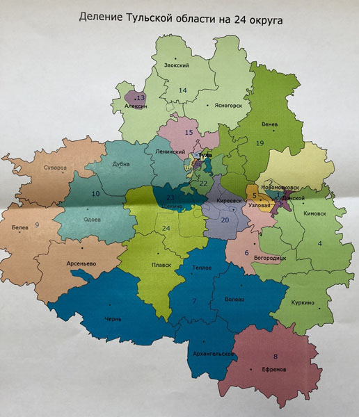 «Если говорить о Туле, — пояснил председатель Избирательной комиссии Тульской области Павел Веселов, — Советский район стал одним избирательным округом, Заречье делится на две части: 16-ый округ – это чистое Заречье, другая часть Заречья и бывшая территория Ленинского района, входящая в городской округ Тула, составили еще один округ. В Пролетарском районе 17-ый и 18-ый округа получились чисто городскими. Сейчас за пределы городского округа Тула выходят только 10-ый и 19-ый округа».