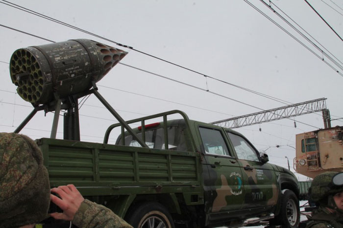 А тут на тачанку поставили установку для стрельбы НУРсами. Насколько эффективна такая схема — сказать трудно.