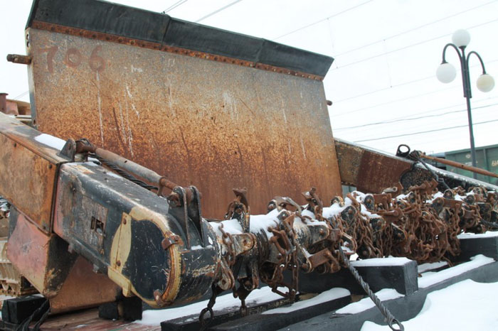 Это рабочая часть этого агрегата. Вал с цепями вращался и инициировал взрыв мины.