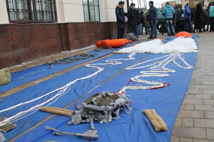 Ещё рядом со зданием вокзала выставка всякой армейской снаряги. Парашюты и средства самоспасения пилотов. То, что синее — это парашютный стол.