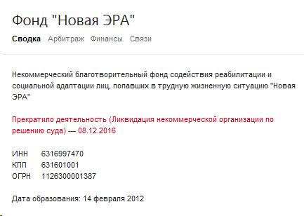 Судя по базам данных юридических лиц, некий фонд «Новая Эра», правда в Самаре, прекратил свою деятельность в 2016 году по решению суда:
