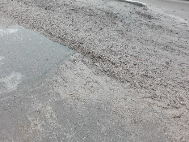 С нашим любимым песком дела обстоят не лучше. Зимой им активно посыпали асфальт даже тогда, когда он уже был полностью очищен и посыпан реагентом (или наоборот). При уборке этого песка его активно сметают на землю возле тротуара, где он спокойно сохнет и ждёт своего часа. Ведь никто не будет убирать песок, если он не на дороге или не на тротуаре. С каждым годом его накапливается всё больше.На фото видно, что уровень недавно отремонтированного тротуара уже намного ниже, чем уровень песка, сметаемого со всех сторон на обочину. Раньше тротуар возвышался над землёй.