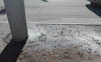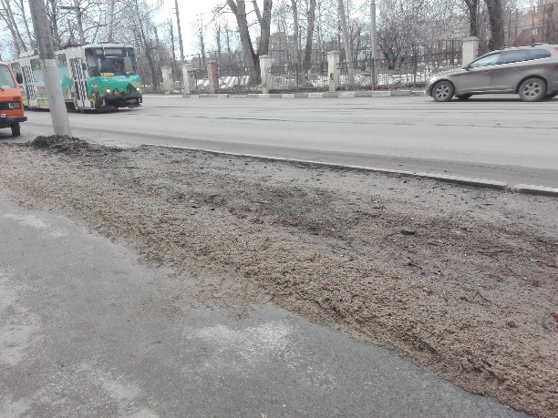 С нашим любимым песком дела обстоят не лучше. Зимой им активно посыпали асфальт даже тогда, когда он уже был полностью очищен и посыпан реагентом (или наоборот). При уборке этого песка его активно сметают на землю возле тротуара, где он спокойно сохнет и ждёт своего часа. Ведь никто не будет убирать песок, если он не на дороге или не на тротуаре. С каждым годом его накапливается всё больше.На фото видно, что уровень недавно отремонтированного тротуара уже намного ниже, чем уровень песка, сметаемого со всех сторон на обочину. Раньше тротуар возвышался над землёй.