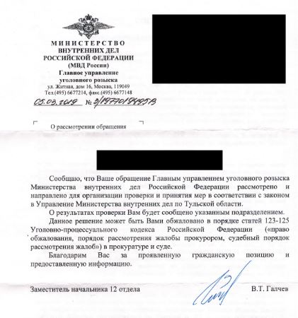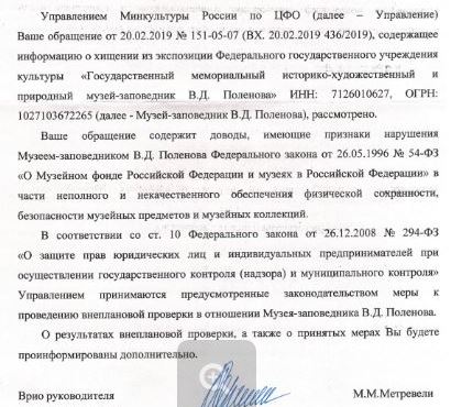 В нашем [«Тульской прессы»] распоряжении оказались ответы от Министерства культуры РФ и МВД РФ по факту сомнений читателей, что некоторые экспонаты в музее находятся на месте. Организованы внеплановые проверки.