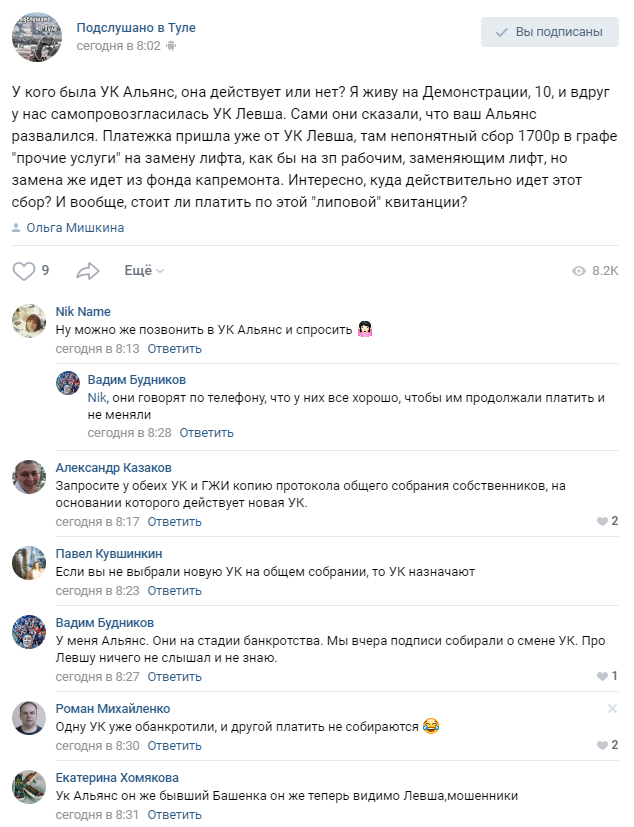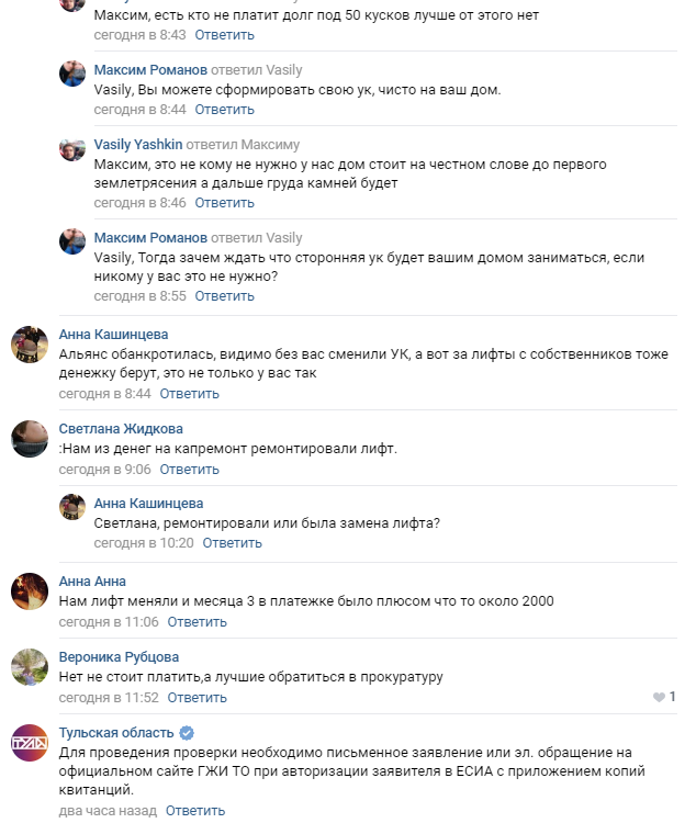 Вопрос знатокам опубликовали в сообществе «Подслушано в Туле» в соцсети. Некто Ольга Мишкина совершенно запуталась, кому платить за коммуналку: «Левша», по ее словам, самопровозгласилась, а «Альянс» — «сами они сказали, что ваш Альянс развалился».