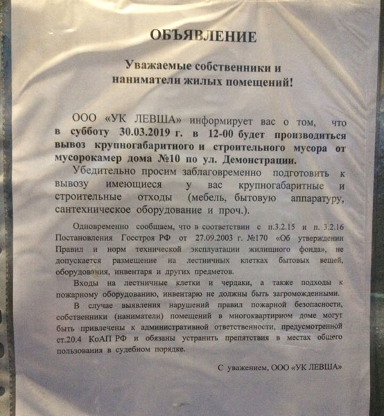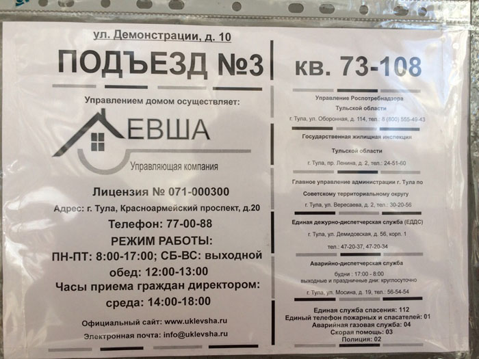 Пока происходит, грубо говоря, какая-то непонятная чертовщина вокруг «УК «Левша», по подъездам дома 10 по улице Демонстрации жители распространили листовки, в которых задаются вопросом: может, это мошенники, и не стоит им платить? В листовках предполагают, что старший по дому – жилец, который недавно приобрел квартиру, — родственник Акининой, поэтому достоверную информацию получить от него не надеются.