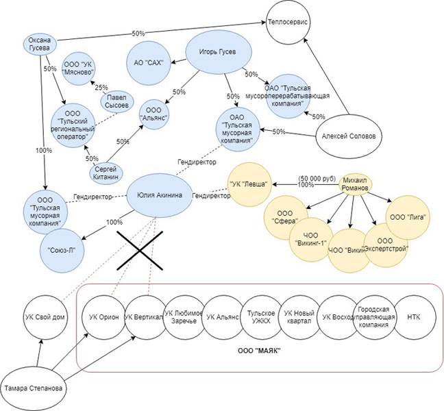 Через ОАО «Тульская мусорная компания» ООО «Тульская мусорная компания» деятельность Акининой, вероятно, координируется руководителем «САХ» Игорем Гусевым и Оксаной Гусевой (вместе с, как говорят, сыном бывшего главы Центрального района Тулы Сергеем Китаниным в равных долях владеет «Тульским региональным оператором», а Китанин с Гусевым – ООО «Альянс»). Можно прийти к выводу, что Акинина – своего рода менеджер управляющих компаний, обеспечивавших доход мусороперерабатывающей группе. Учитывая, что теперь в Тульской области появились региональные операторы, столичные фирмы «Хартия» и «МСК-НТ», вопрос выживаемости частного бизнеса тульских предпринимателей крайне актуален.