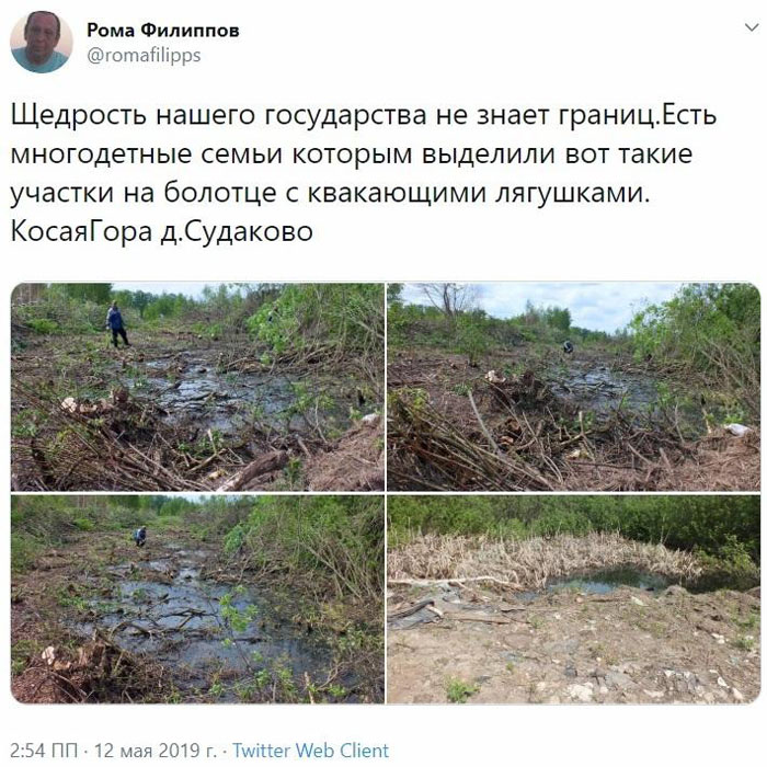 «Щедрость нашего государства не знает границ. Есть многодетные семьи которым выделили вот такие участки на болотце с квакающими лягушками…», — написал он в соцсети.