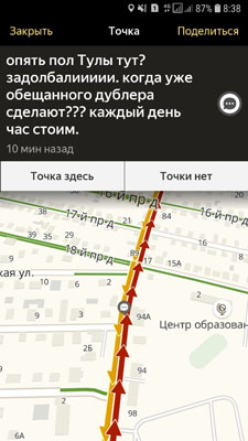 И вроде как есть предложение строительства дублера улицы Карпова, но это все пока предложения, да и строительство новой дороги за месяц не закончится. Власти же предпочитают игнорировать эту проблему и жалобы жителей. Можно же расширить дорогу или регулировать поворот налево (сотрудники ДПС, светофор).Светофор там вполне возможно поставить, регулируя поворот налево, оставив стрелку направо всегда горящей. Невозможно каждый день по часу стоять. По навигатору даже улица Советская так не стоит, как стоит Карпова (ниже на фото). И встает улица благополучно утром и вечером.