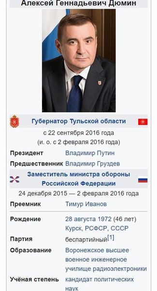 На сайте крупнейшей онлайн-энциклопедии «Википедия» отредактирована страница с биографическими сведениями о губернаторе Тульской области Алексее Дюмине.