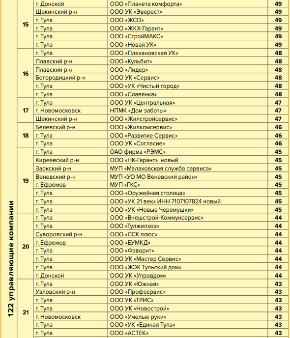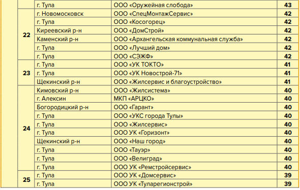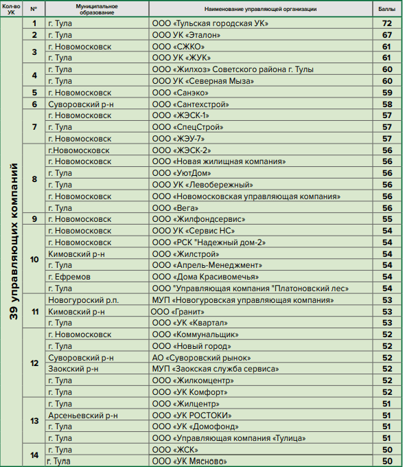 В «зелёную» зону попали 39 УК, в «жёлтую» — 122, в «красную» — 27. Лидером оказалась «Тульская городская УК».