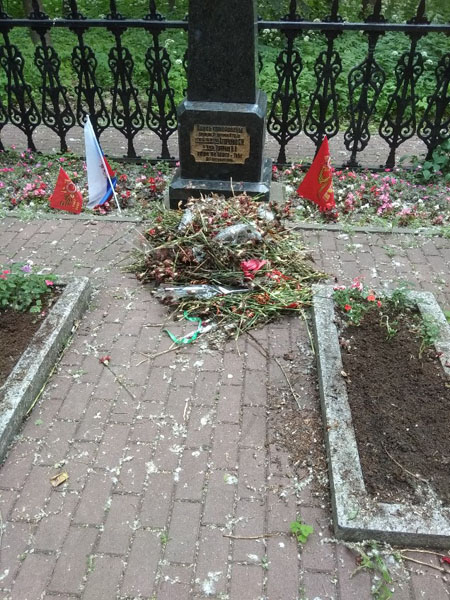 Могила и памятник неухоженные, а венки и цветы лежат наверное с Дня Победы.
