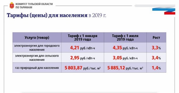По традиции, цены на электроэнергию и газ будут едиными для всей Тульской области. На тепло и воду – разными для каждой ресурсоснабжающей организации. Подробную информацию об изменении тарифов конкретно вашей ресурсоснабжающей организации можно посмотреть здесь.