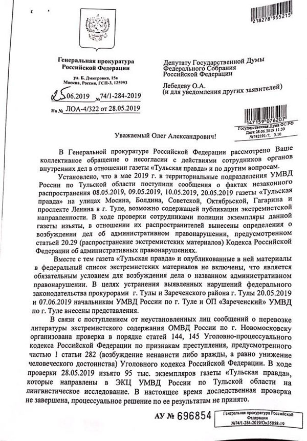 Вместе с тем «Тульская правда» и опубликованные в ней материалы не включены в федеральный список экстремистских материалов, что является обязательным для возбуждения дела по статье 20.29 КоАП РФ. В связи с этим начальникам УМВД по Туле и отдела полиции «Зареченский» внесены представления.