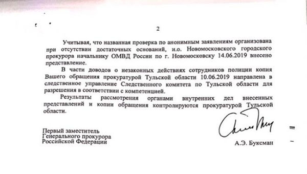 Учитывая, что проверка по анонимным заявлениям организована при отсутствии достаточных оснований, начальнику ОМВД по Новомосковску внесено представление.