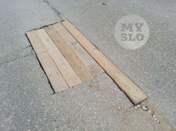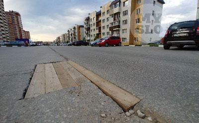 Дорожную яму, судя по аккуратно вырезанным краям, подготовленную для ремонта, местные автомобилисты заложили досками. Дерево оказалось ничем не хуже асфальта – правда, неизвестно, сколько такая «заплатка» продержится.