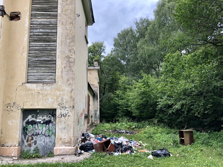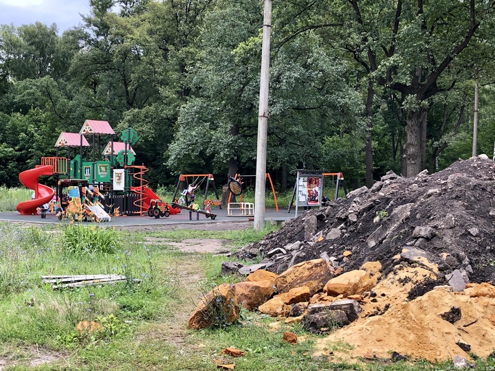 Сейчас здание утопает в горах строительного песка и щебенки – рядом делают широкую пешеходную дорожку через лес. За высокой горой раскопанной строителями земли виднеется симпатичный детский городок – прямо напротив руинированных стен ДК и кучек мусора. На этом «пятачке» городского благоустройства две молодые семейные пары выгуливают своих чад и еще два подростка занимают качели, погрузившись в телефоны.