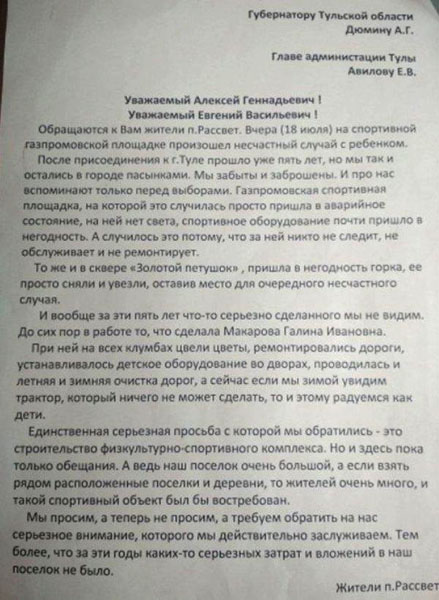 Жители посёлка Рассвет бывшего Ленинского района написали обращение губернатору Тульской области Алексею Дюмину и главе администрации Тулы Евгению Авилову.