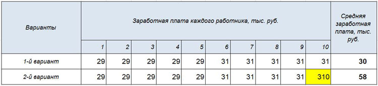 Единственное отличие между вариантами состоит в высокой зарплате работника 10, из-за чего средняя зарплата во 2-м варианте выросла почти в 2 раза. В такой ситуации будет понятно удивление и возмущение информацией о средней зарплате, ведь почти у всех работников зарплата гораздо ниже средней.