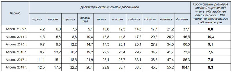 В настоящее время статистика дает возможность более глубоко оценить разницу в зарплатах, предоставляя данные с разбивкой работников по группам, например, по децильным (десятипроцентным) группам. Росстат уже давно начал проводить раз в 2 года (за апрель нечетного года) выборочные обследования распределения численности работников по размерам зарплаты. Последнее на данный момент обследование прошло в этом году, неделю назад его результаты были размещены на сайте Росстата.