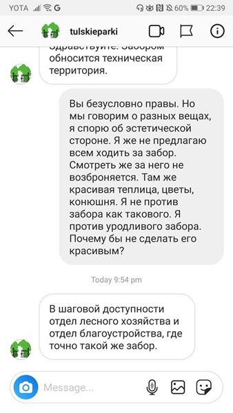 «Добрый день! Хочу поделиться своей маленькой историей с Белоусовским парком, может вы об этом напишете. На прошлой неделе работники начали менять деревянный забор, отделяющий теплицу и конюшню. Тот самый красивый деревянный забор. Теперь вместо него будет сплошной зелёный металлический. Закрывают и теплицу с цветами и конюшню. Моя переписка с тульскими парками показала их полную неспособность вести хоть какой-то диалог. Рабочие сказали мне, что предлагали другие варианты (с рабицей как минимум), но дирекция решила ставить этот…»