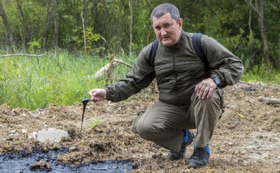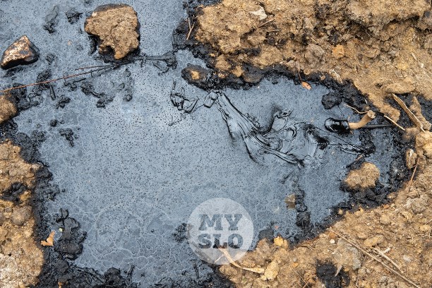 – Говорят, что лет 30 назад сюда сливал отходы какой-то завод. Недавно мазут прикапывали землей с помощью трактора – видите, следы техники еще свежие. Но лужа появилась снова.