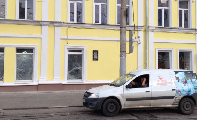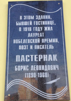 За время своего существования памятная доска о пребывании в нашем городе Бориса Леонидовича Пастернака уже в третий раз меняет место своего расположения. Сначала она была установлена на фасаде дома N 54, который выходит на улицу Советскую. Затем ее перенесли за угол, на улицу Фр. Энгельса. И вот теперь она оказалась еще дальше — напротив трамвайной остановки.