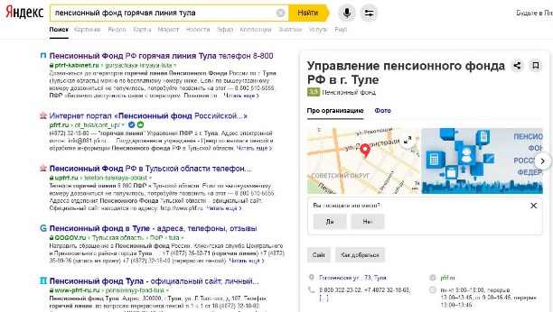 Сегодня Сергей искал в Яндексе телефон бесплатной горячей линии Пенсионного фонда. Поисковик подкинул ему вот такое: