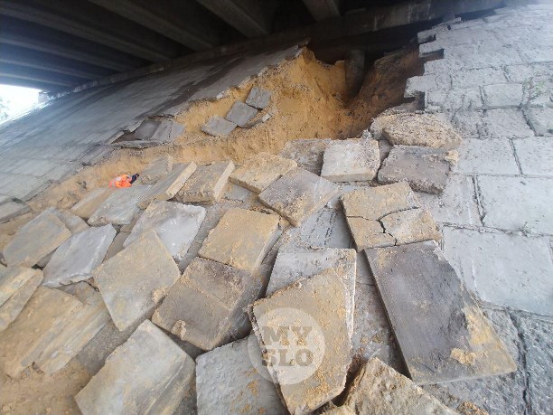 …17 августа на мостовом сооружении на ул. Новомосковской произошло размытие песка из откосов сооружения из-за сильного дождя.