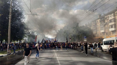 Футбольные фанаты устроили шествие с файерами по российскому городу