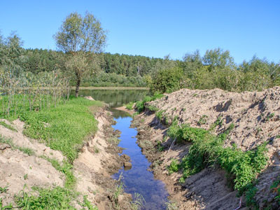 — А теперь — кошмар, всюду ил,— переживает Елена Евгеньевна.— Драга курсирует от Нивы фактически всё лето. Если так будет продолжаться и дальше, река станет болотом. Особенно работа драги докучает по ночам. Но вот что интересно: драга есть, а барж незаметно, хотя обычно их — две, одна под загрузку, вторая уходит со щебнем. Думаем, дело в том, что щебёнку просто намывают, и предполагаем, что это делается для обустройства вот этой зоны,— она указывает на огромный ров с водой и территорию за ним, к которым подошла с корреспондентом.