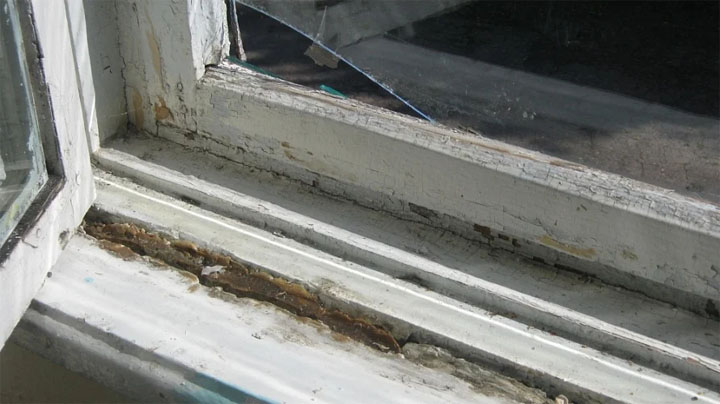 При визуальном осмотре фасада и оконных блоков видны трещины в деревянных конструкциях рам. Рамы ветхие, гнилые, частично разрушены, плохо удерживают остекление, что не позволяет их открывать и осуществлять режим проветривания, представляют опасность жизни и здоровью обучающихся и сотрудников.