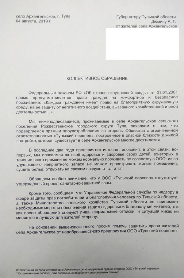 «Мы, нижеподписавшиеся, проживаемые в селе Архангельское сельского поселения Рождественское городского округа Тула, заявляем о том, что подвергаемся прямым злоупотреблением со стороны ООО «Тульский перепел», построенное в опасной близости к жилой застройке, которая существует в селе Архангельское многие десятилетия.