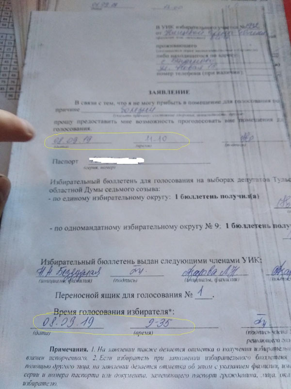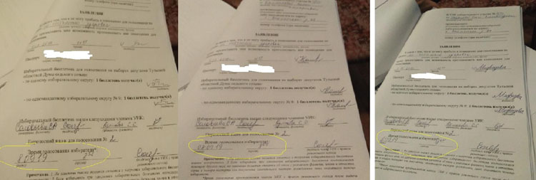 Также на этом участке попадались интересные заявления, в которых избиратели, несмотря на то, что оставляли заявление на голосование в 11 часов дня, умудрялись «по документам» проголосовать в 9 часов. Мистика!