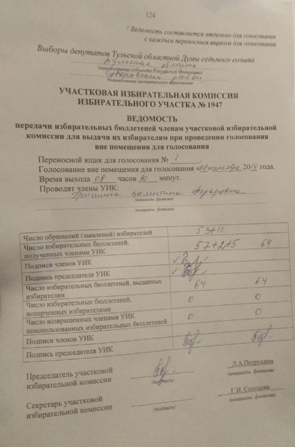 Выяснялась еще одна интересная деталь – практически на всех УИКах выписка из реестра переносного голосования не прочеркивалась снизу, создавая большой простор для голосования дополнительных человек, не оставлявших заявку на переносную урну. Дело в том, что согласно законодательству, число людей, к которым приезжает переносная урна в конкретном выезде должна соответствовать числу обращений от этих самых людей. И если фамилия человека отсутствует в выписке из реестра, то проголосовать на дому при данном выезде урны он НЕ ИМЕЕТ ПРАВА, а в случае, если он все же проголосует, то вся переносная урна должна быть признана недействительной. Если выписка из реестра остается непрочеркнутой, то дополнительные фамилии всегда можно дописать «по ходу пьесы», что и получилось на УИК 1922 в поселке Центральный, когда урна отправляющаяся на 20 заявок, приехала уже с сотней бюллетеней. Однако, даже если тупо вписать дополнительные фамилии в выписку из реестра, число заявок в ведомости передачи бюллетеней на голосование на дому останется прежним. Обойти эту «деликатную проблему» разные председатели УИКов пытались по разному. Так, на участке в Лужсковском число «лишних» бюллетеней было дописано в ведомость через знак «плюс». Таким образом, в ведомости указано не целое число, Так число бюллетеней выданных на данном участке согласно ведомости составляло не целое число, а составное (53+11). В Ханино и вовсе не стали заморачиваться с расхождениями бюллетеней в урне и по ведомости, и заявили, что просто ошиблись, написав в ведомости неверное число.