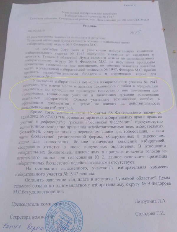 Таким образом, как и в судебном заседании по моему иску на снятие кандидата от «коммунистов россии» (https://vk.com/id161147513?w=wall161147513_879/all) все расхождения и несоответствия в документах избирательной комиссии объяснили просто технической ошибкой. Подумаешь, взял 100 бюллетеней, а в ведомость записал 25. Ошибся, с кем не бывает. Кстати, председатель Суворовского ТИКа Галдин Ю. И. за массовую некомпетентность своих подчиненных (грубые ошибки в документах, неумение пользоваться часами, отсутствие проверки и пересчета подписных листов при их подаче и др.) не просто не был подвергнут взысканию, а был награжден званием Почетного гражданина Суворовского района.