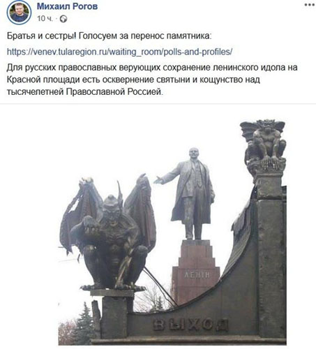 Православный общественник из Венёва в фейсбуке призвал «братьев и сестёр» поддержать декоммунизацию, заявив, что «для русских православных верующих сохранение ленинского идола на Красной площади есть осквернение святыни и кощунство над тысячелетней Православной Россией».