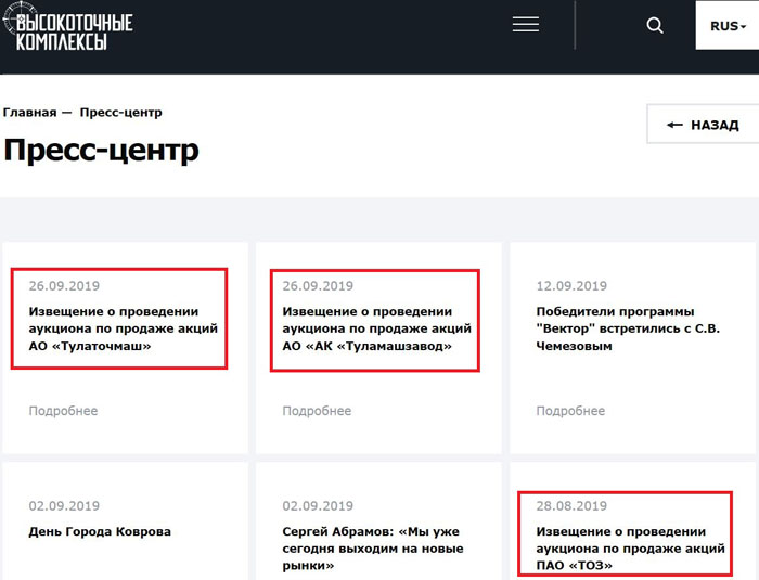 На официальном сайте холдинга «Высокоточные комплексы» разместили извещения о проведении аукционов по продаже акций Туламашзавода и АО «Тулаточмаш»: