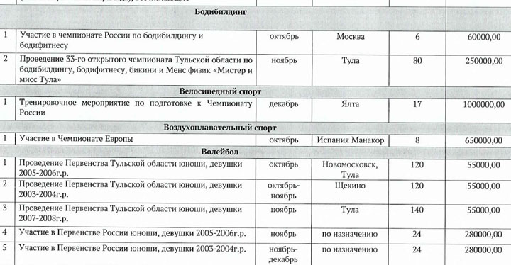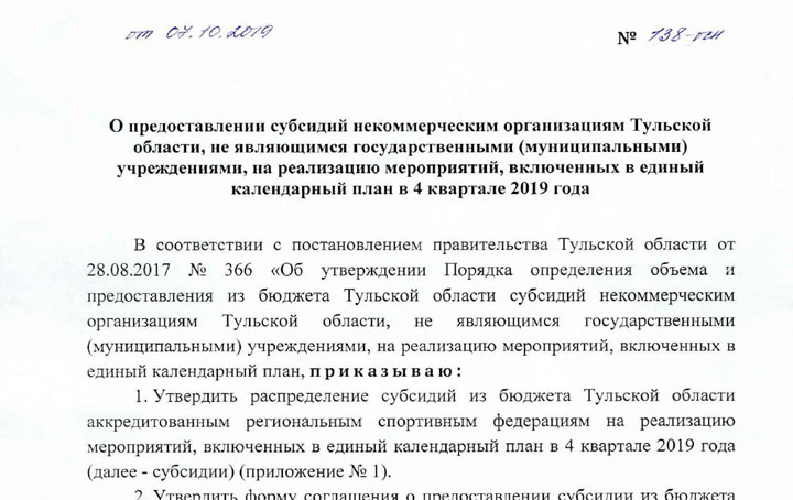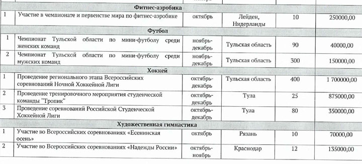 Такой вывод можно сделать, анализируя цифры из подписанного Сергеем Ивашковым приказа комитета Тульской области по спорту о предоставлении субсидий некоммерческим организациям Тульской области, не являющимися государственными (муниципальными) учреждениями, на реализацию мероприятий, включенных в Единый календарный план в 4-м квартале 2019 года.