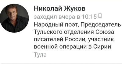 Родион Газманов прокатился в Сирию и получил «участника боевых» о чем с гордостью похвалился в своём инстаграм. А зря… Не ищите — этих фото уже нет. Затравили мальчика эти злые звери со своими понятиями о какой-то чести и достоинстве. Зря что-ли папа столько лет выслуживался? Нам тулякам это не удивительно. У нас есть свой «участник»: графоман… Пардон, «народный поэт» и даже Председатель… Ну, какой Союз [тульское региональное отделение Союза писателей России], такой и председатель. Я просто подумал: «А может все же не за то, что прокатился в Сирию, а за такие «стихи»?»